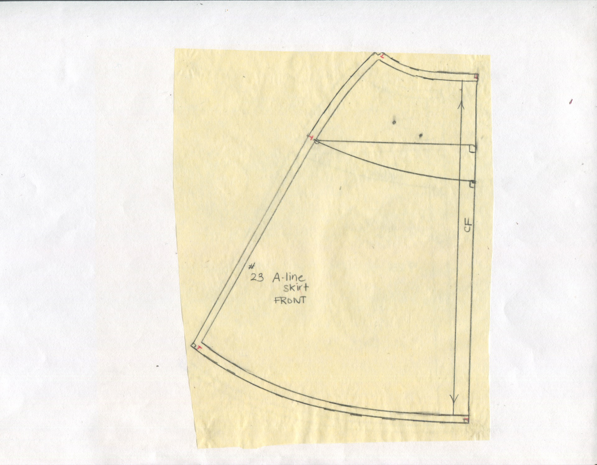 Note on the left of each picture we have a basic straight skirt shape with two waist darts. Again, this is half a skirt front and back, and would be cut on the fold, unless you wanted the seam down the center front and back. Here I’m slashing up those lines and closing the darts to create what is known as an A-line skirt (because it’s shaped like an A…real clever). Here’s what the A-line pattern would look like: