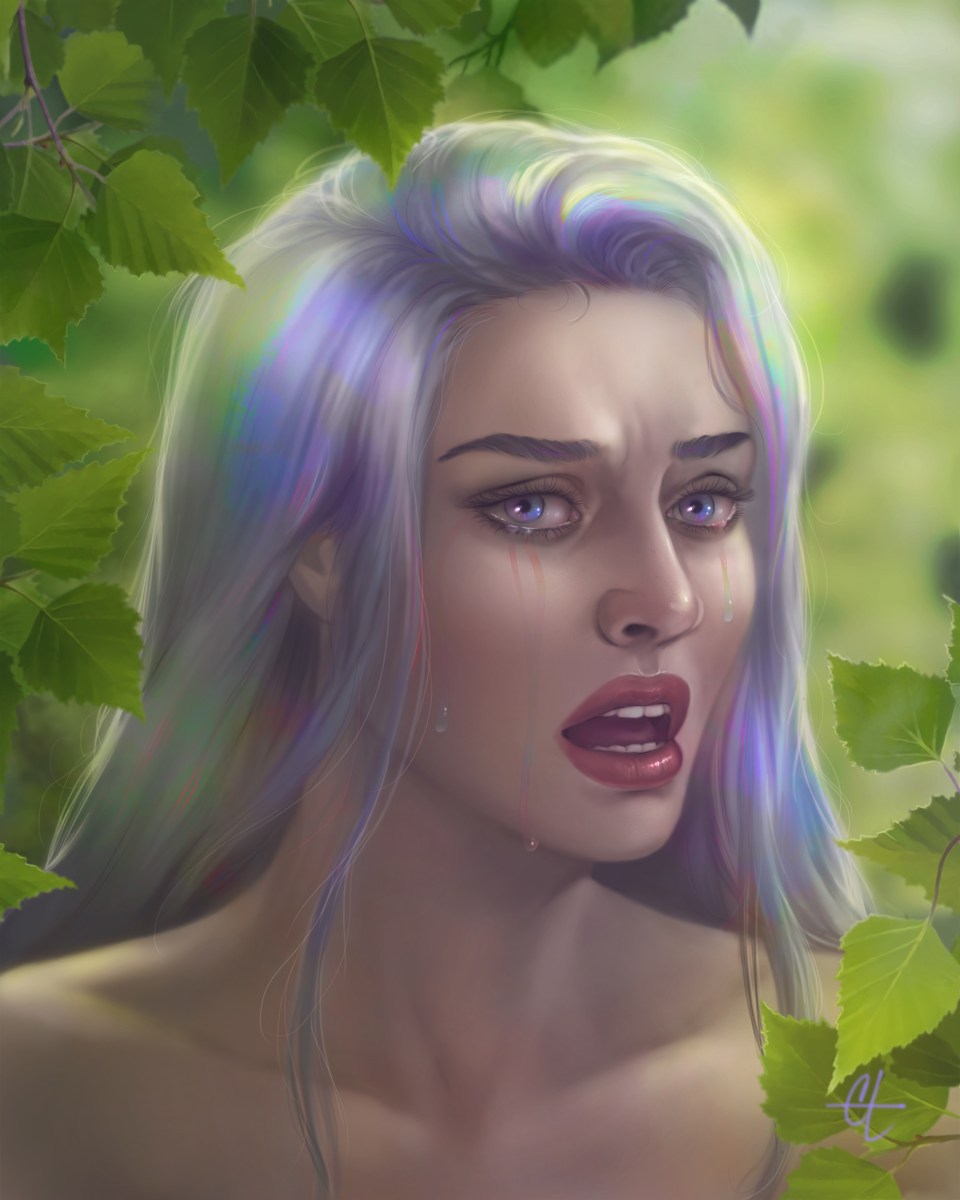 Isabel Damaria is an OC in a story I’ve been working on. In this scene, she’s been spied early one morning in the gardens of Tyr Morgain by someone very close to her, who doesn’t understand what the magic he is seeing is or why she is in pain. Her tears and hair shimmer with the iridescent glow (or taint?) of a mysterious power in the sacred groves of light in which she supplicatingly kneels. This grave moment begins to weave a thread of misunderstanding between the two that will affect them all their lives.