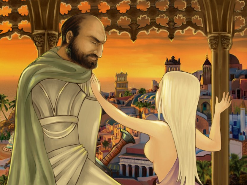 I had to draw this A Clash of Kings scene after weeks of hunky Iain Glen’s performances on A Game of Thrones. I can literally see him burying his undying love painfully every time he’s about to speak to Dany. It’s marvelous.